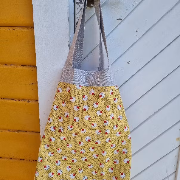 Romslig handlenett sydd i 100% bomullsstoff av quiltekvalitet og canvas innveldig.  Handlenettet er dobbelt, og har ikke innvendige lommer.