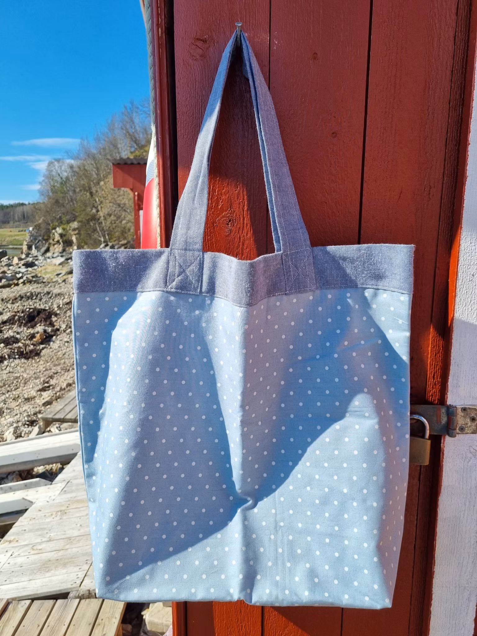 Romslig handlenett sydd i 100% bomullsstoff av quiltekvalitet og canvas innveldig.  Handlenettet er dobbelt, og har ikke innvendige lommer.