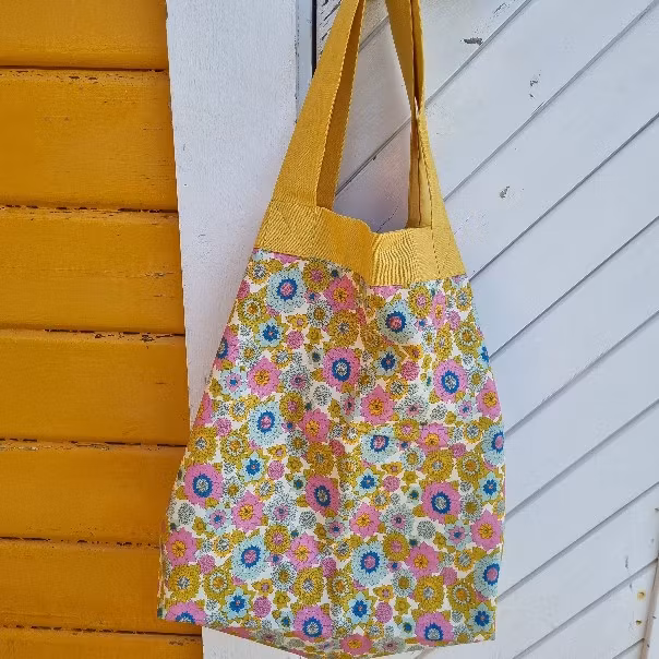 Romslig handlenett sydd i 100% bomullsstoff av quiltekvalitet og canvas innveldig.  Handlenettet er dobbelt, og har ikke innvendige lommer.
