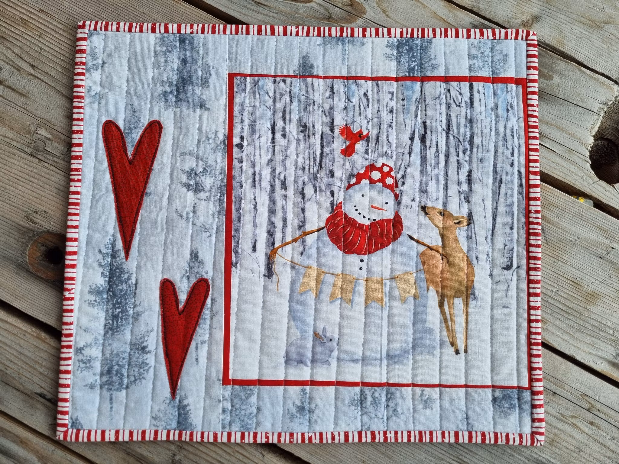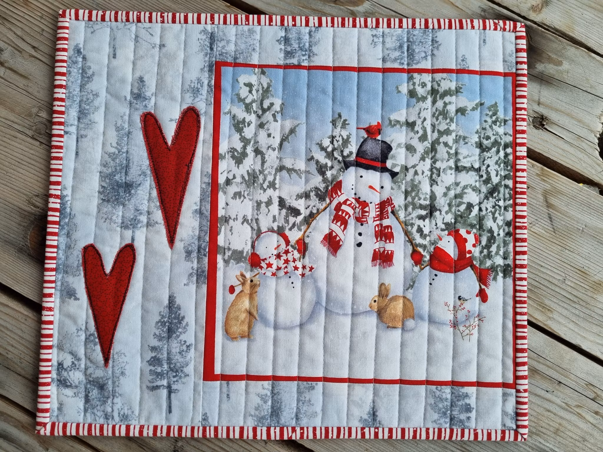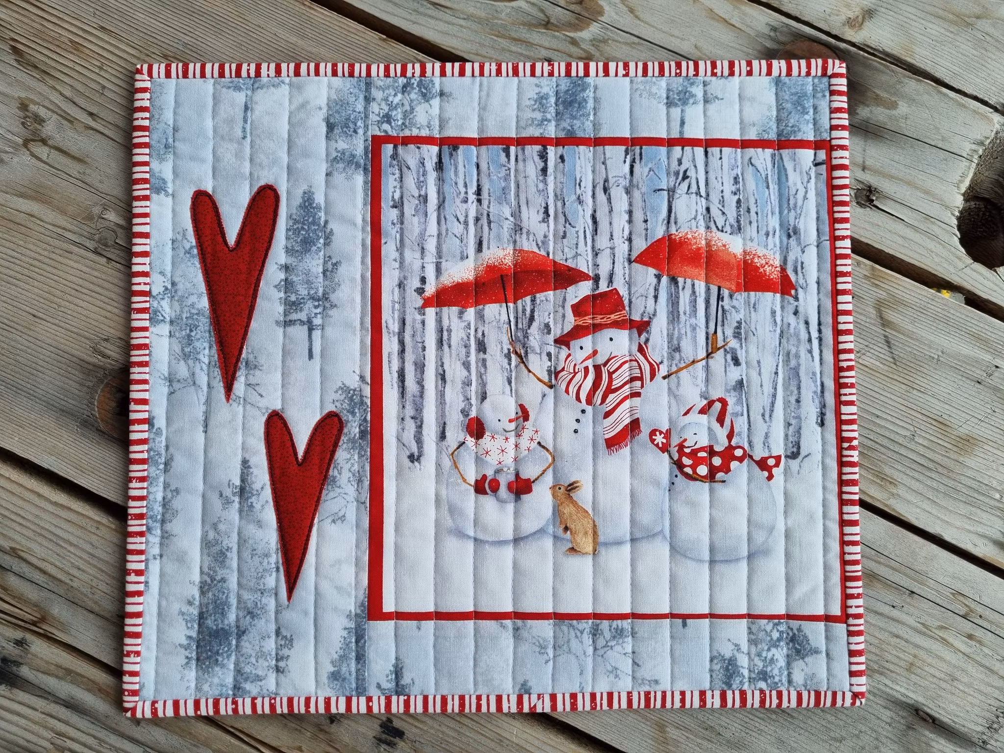 Hvite spisebrikker med motivstoff av snømenn i julemodus, og applikerte røde hjerter.