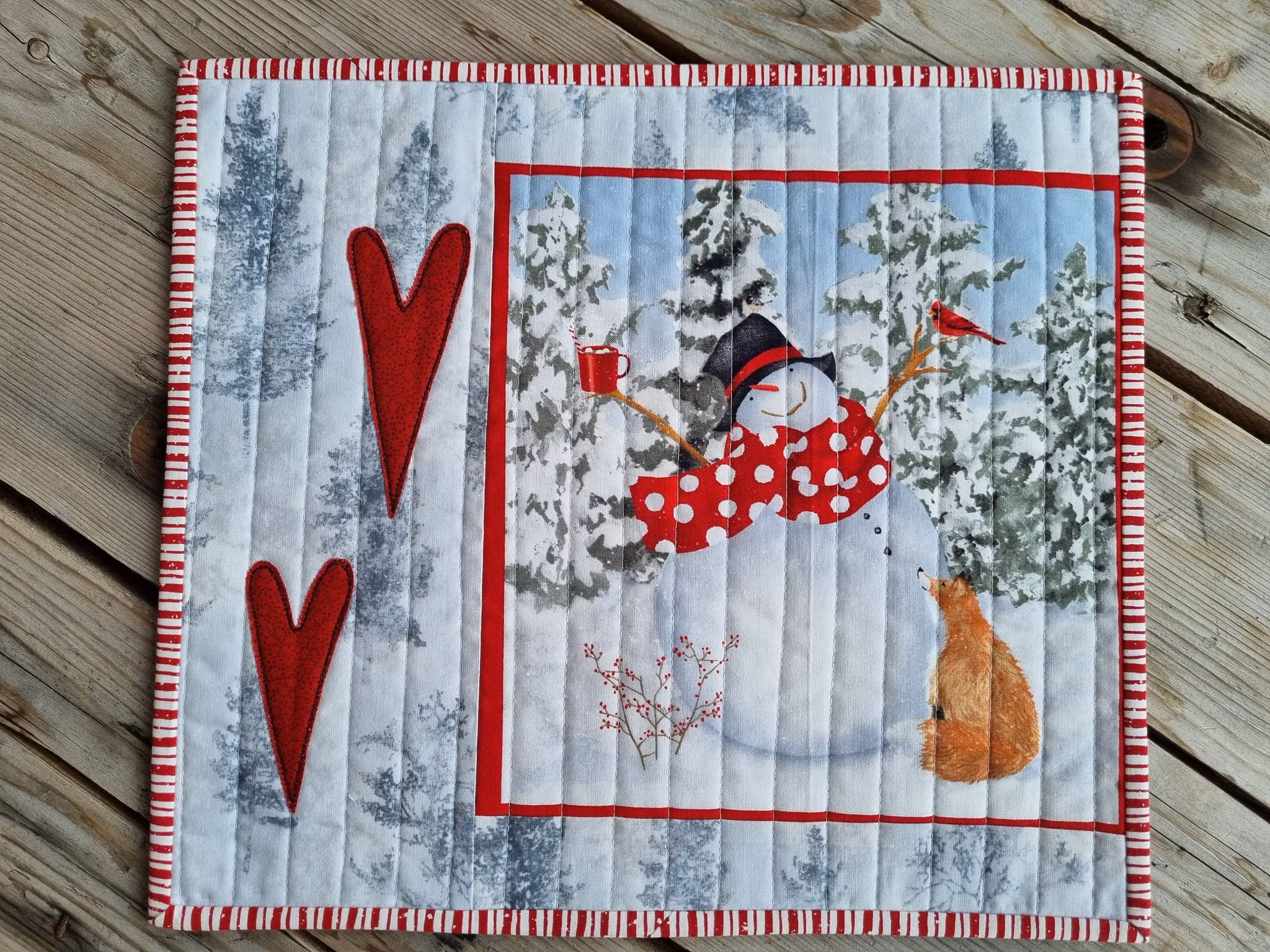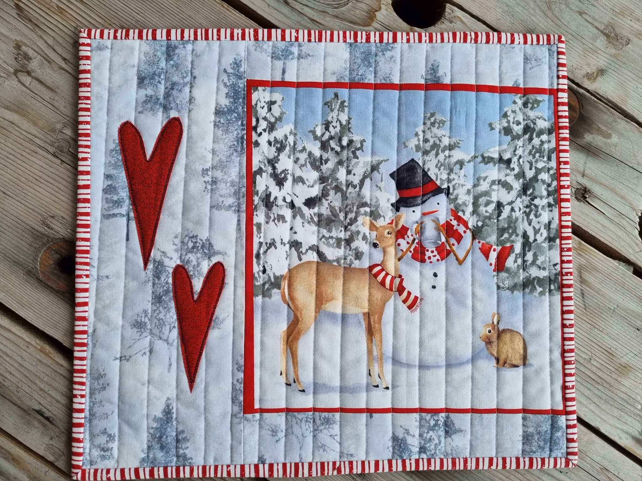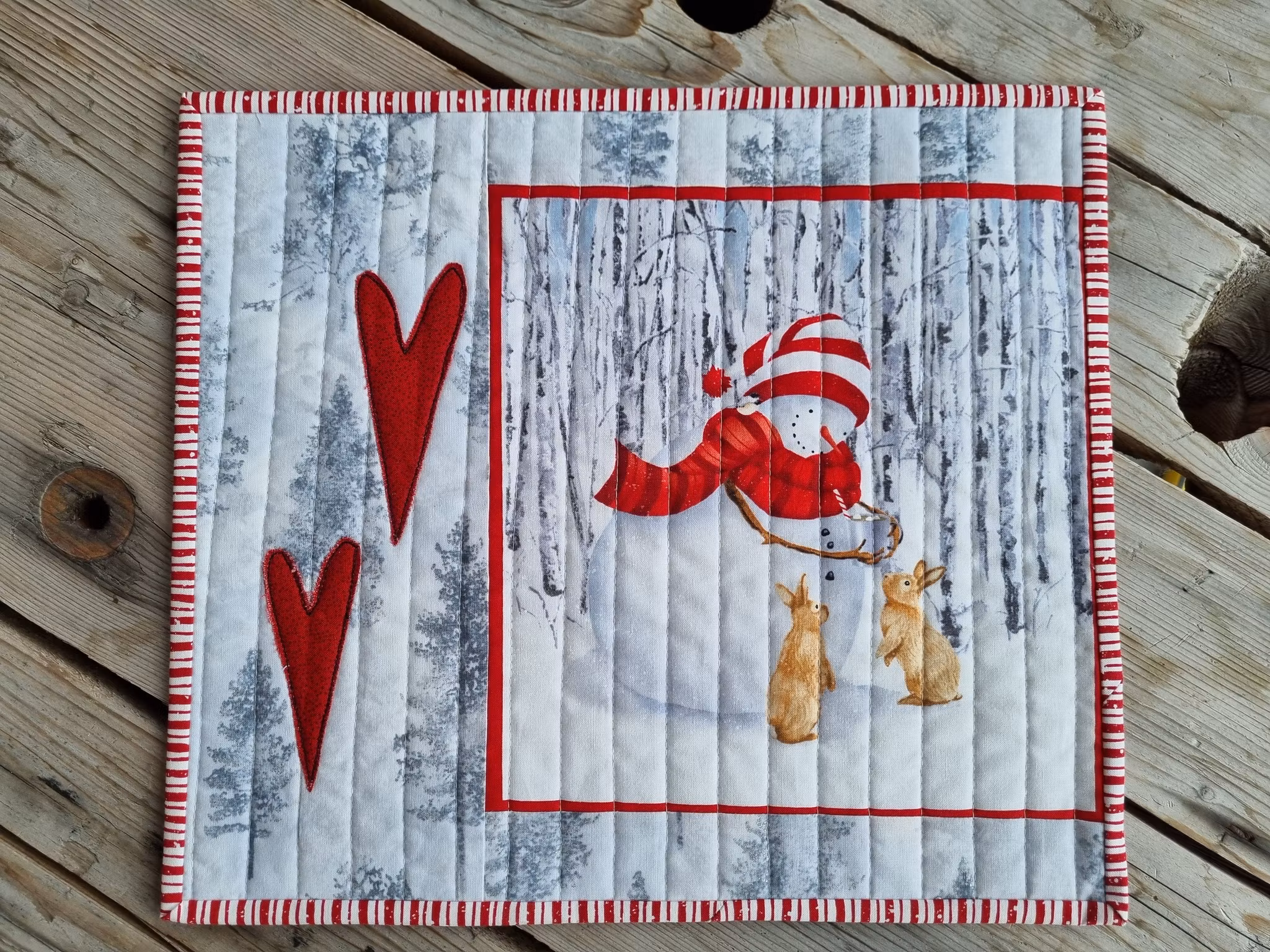 Hvite spisebrikker med motivstoff av snømenn i julemodus, og applikerte røde hjerter.