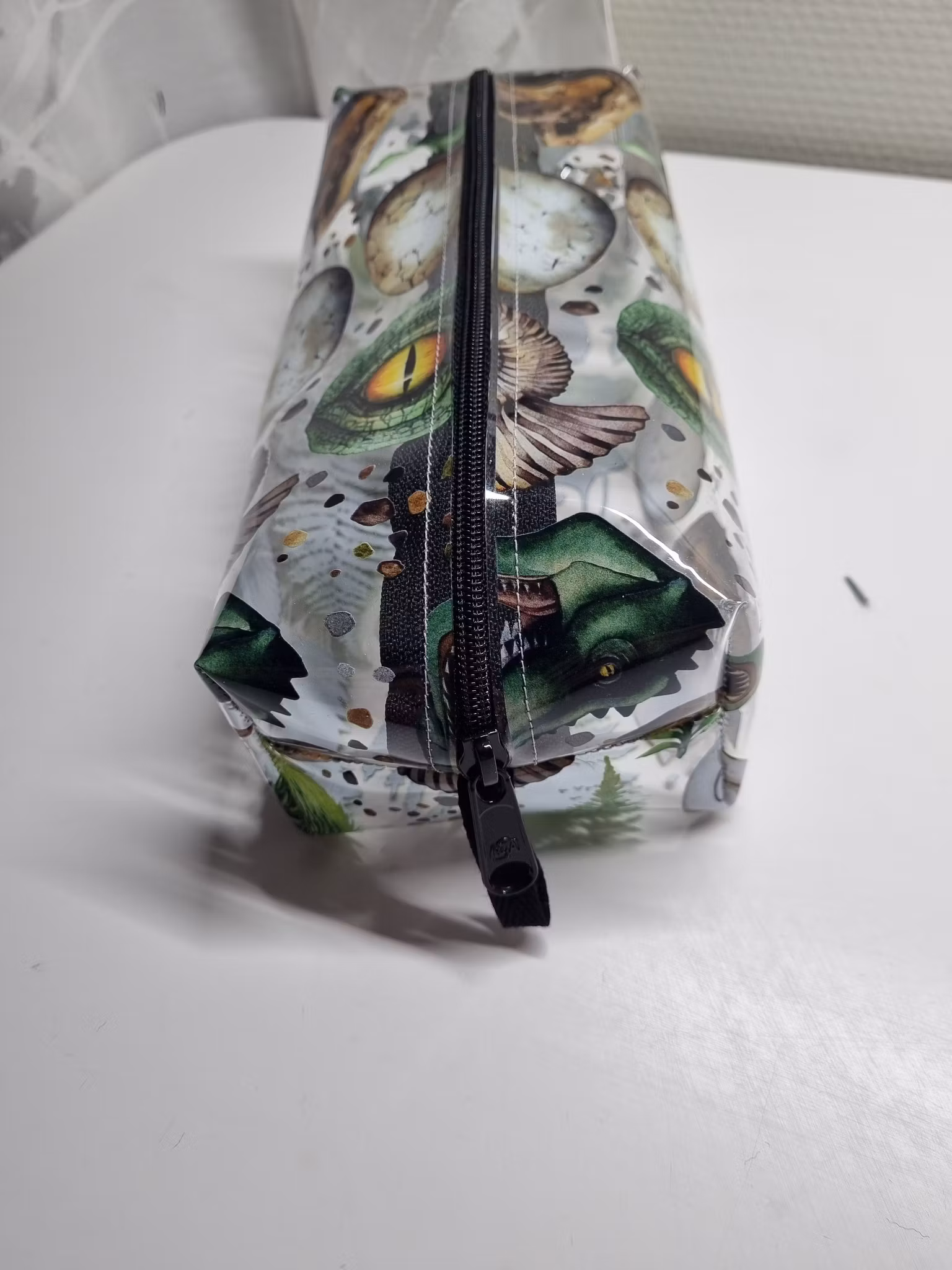 Mappe sydd i dekorplast.  Solid glidelås i toppen.  Egner seg fint til å ha badetøy i, leker på stranda, pennal, div utstyr o.l.