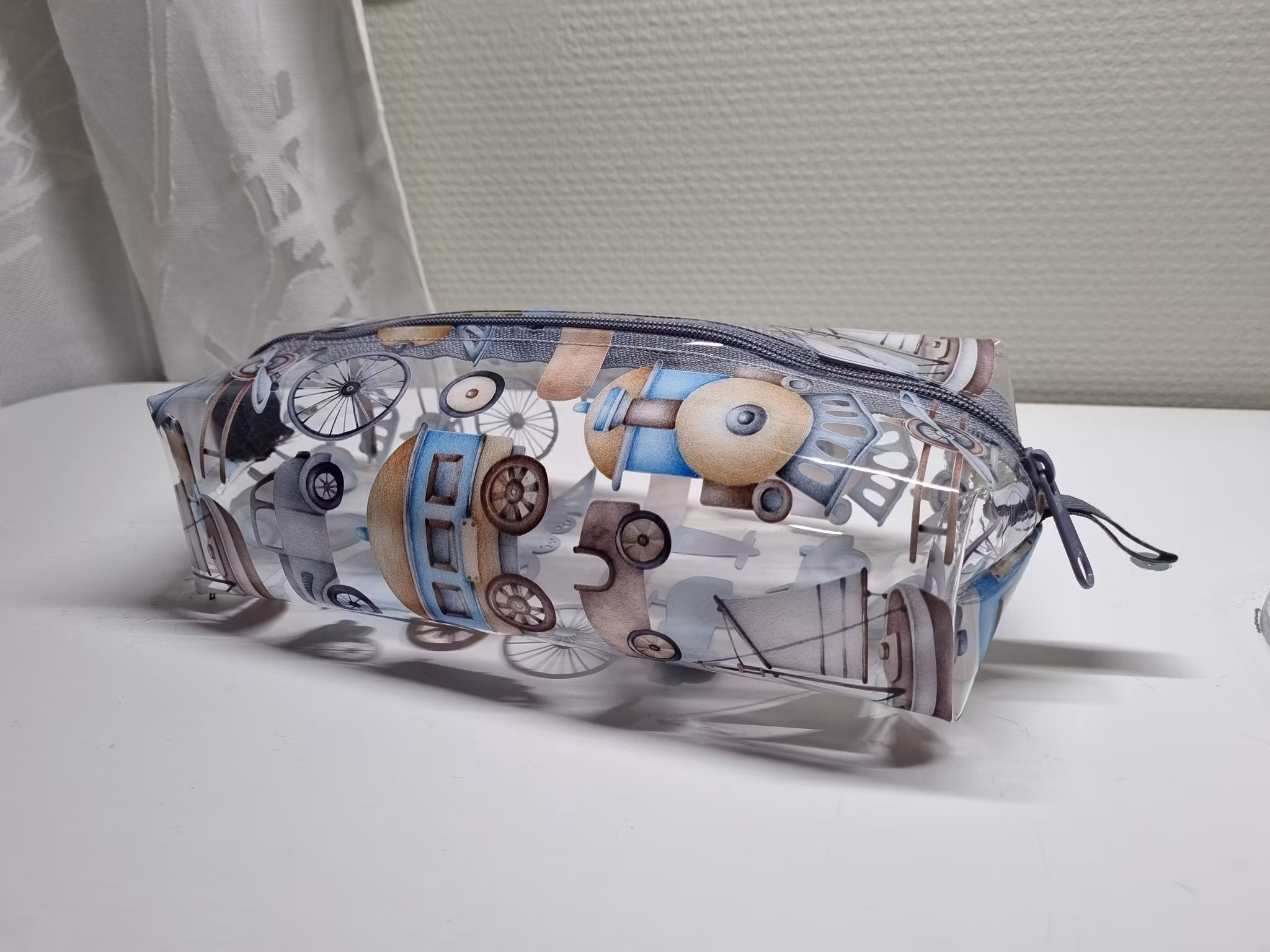 Mappe sydd i dekorplast.  Solid glidelås i toppen.  Egner seg fint til å ha badetøy i, leker på stranda, pennal, div utstyr o.l.