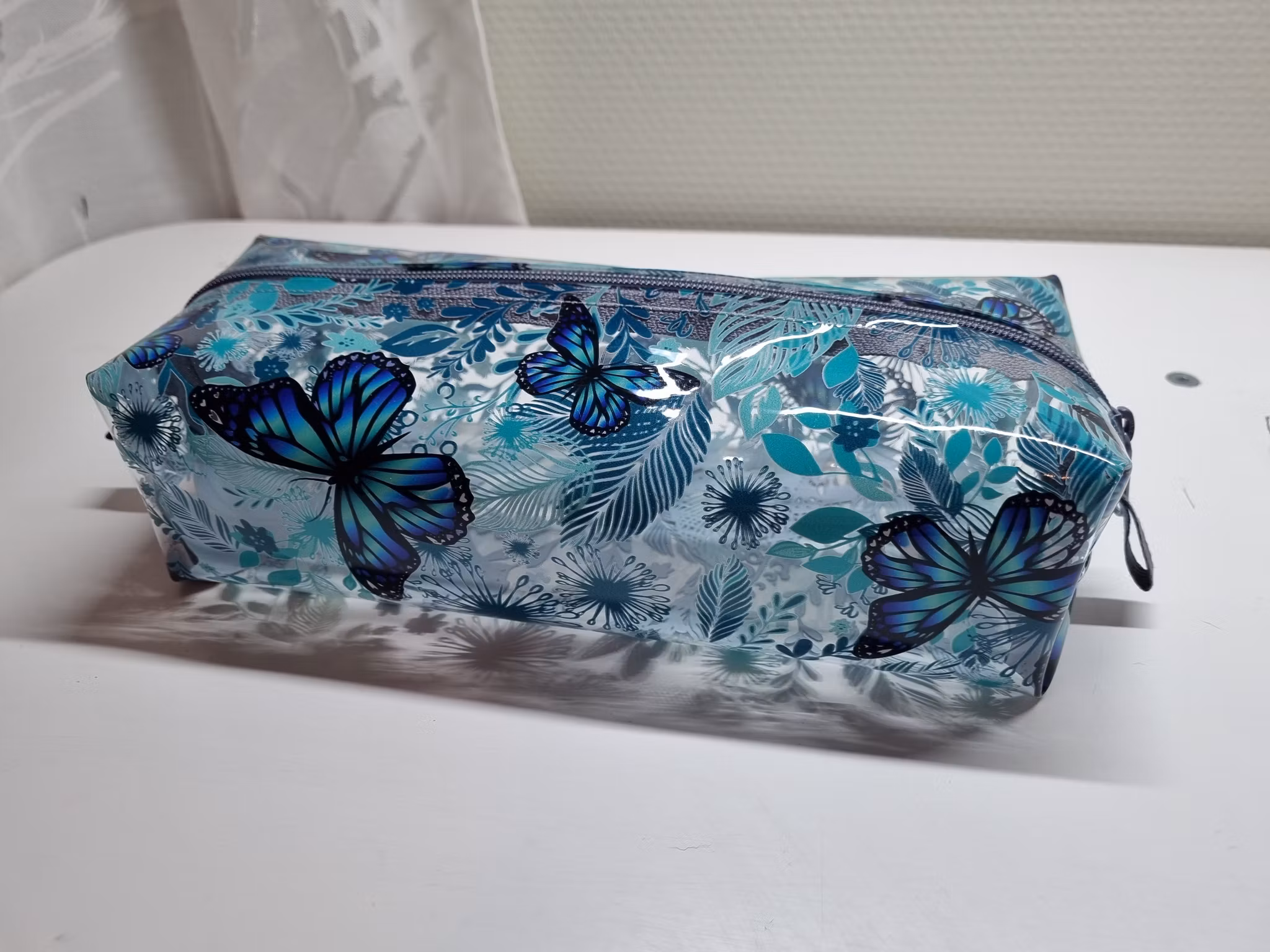 Mappe sydd i dekorplast.  Solid glidelås i toppen. Egner seg fint til å ha badetøy i, leker på stranda, pennal, div utstyr o.l.
