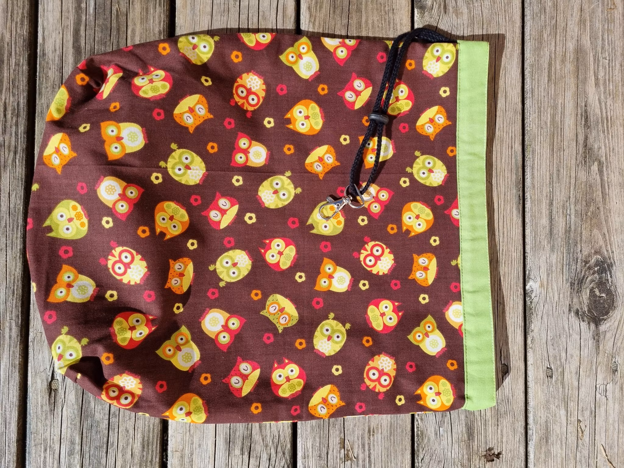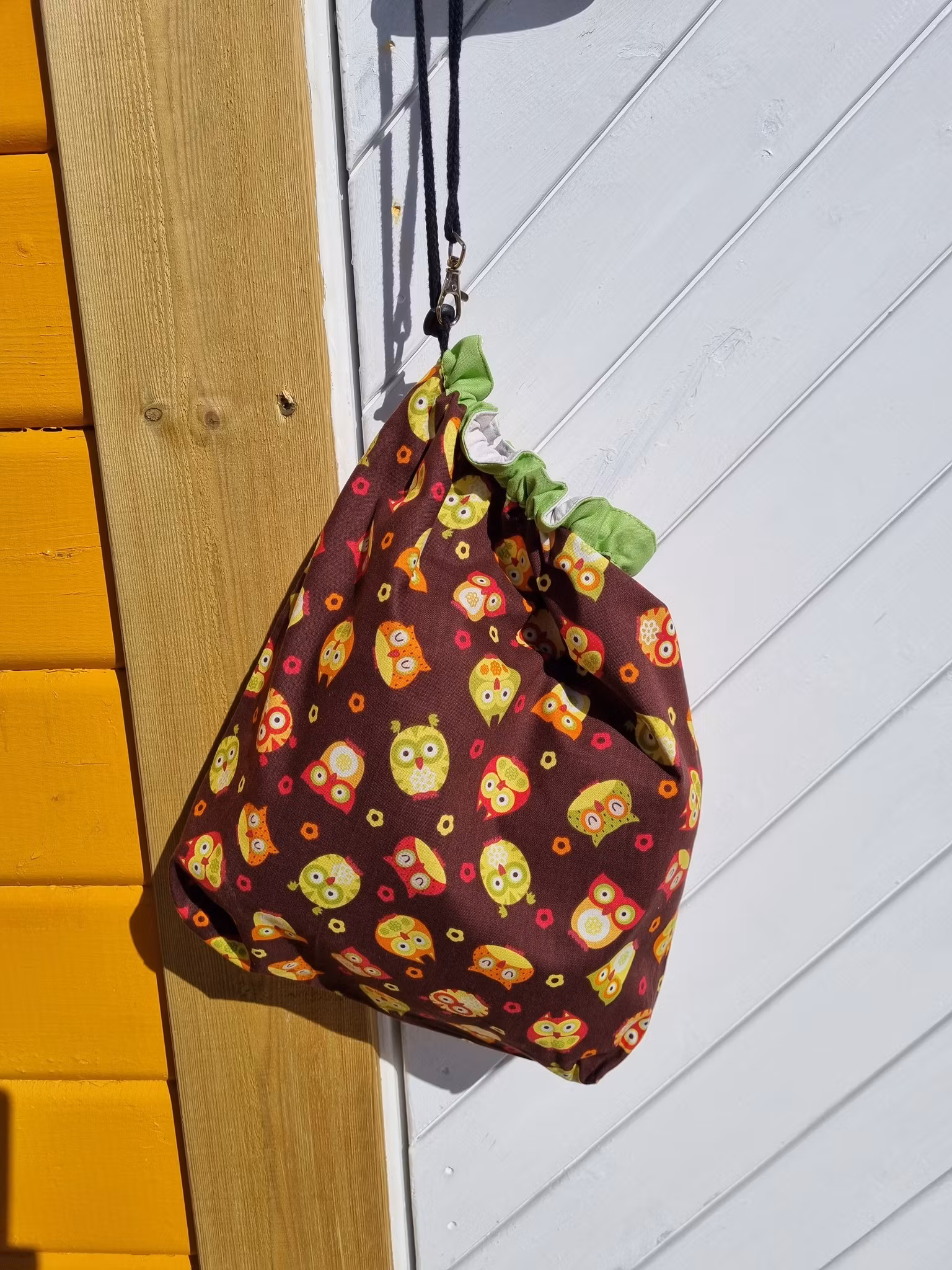 Snørepose med snorstopper og karabinkrok som som passer fint til mindre prosjekter, nattøy osv.  Posen er sydd i 100% bomull av quiltekvalitet og foret med