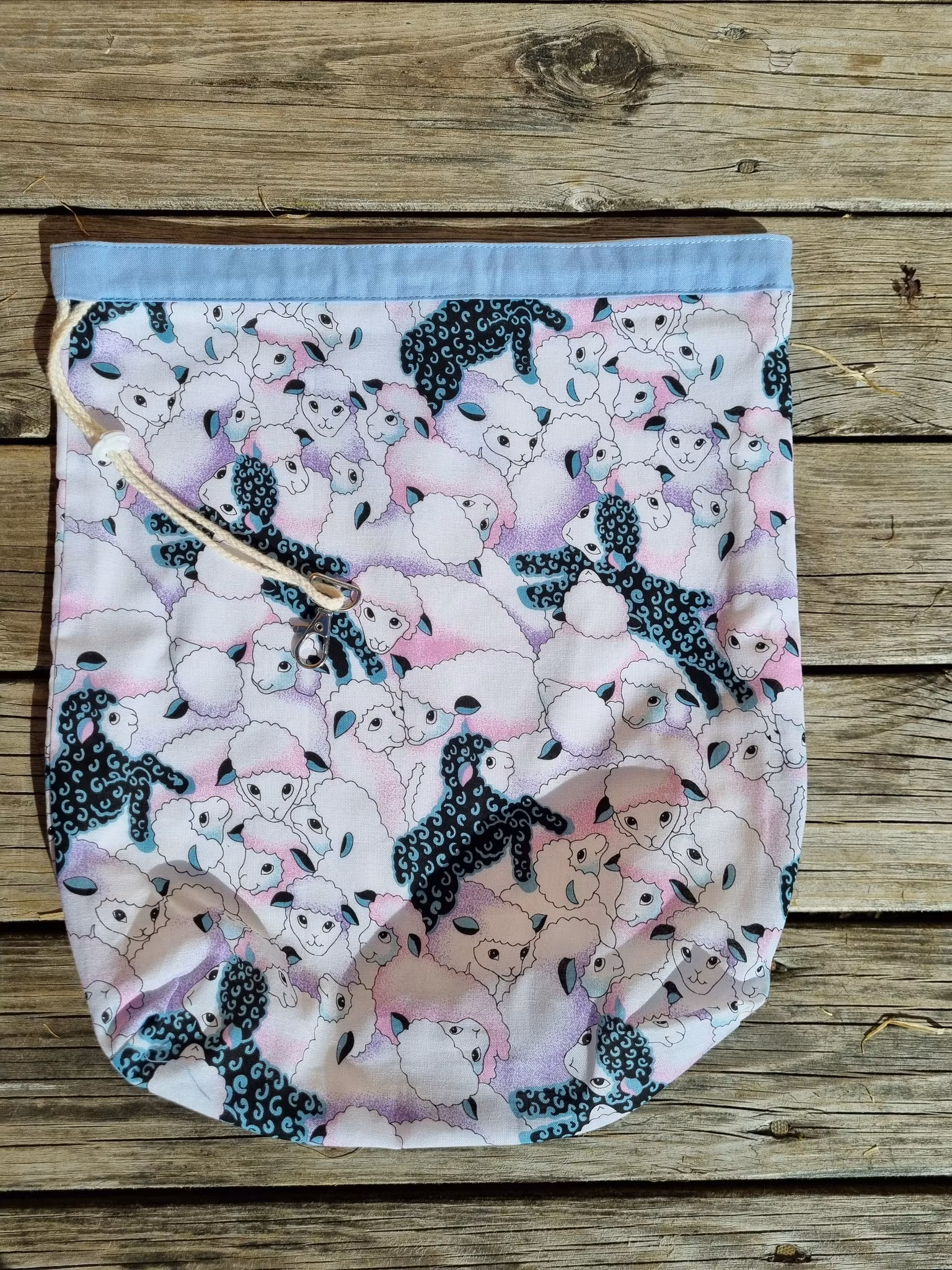 Snørepose med snorstopper og karabinkrok som som passer fint til mindre prosjekter, nattøy osv.  Posen er sydd i 100% bomull av quiltekvalitet og foret med
