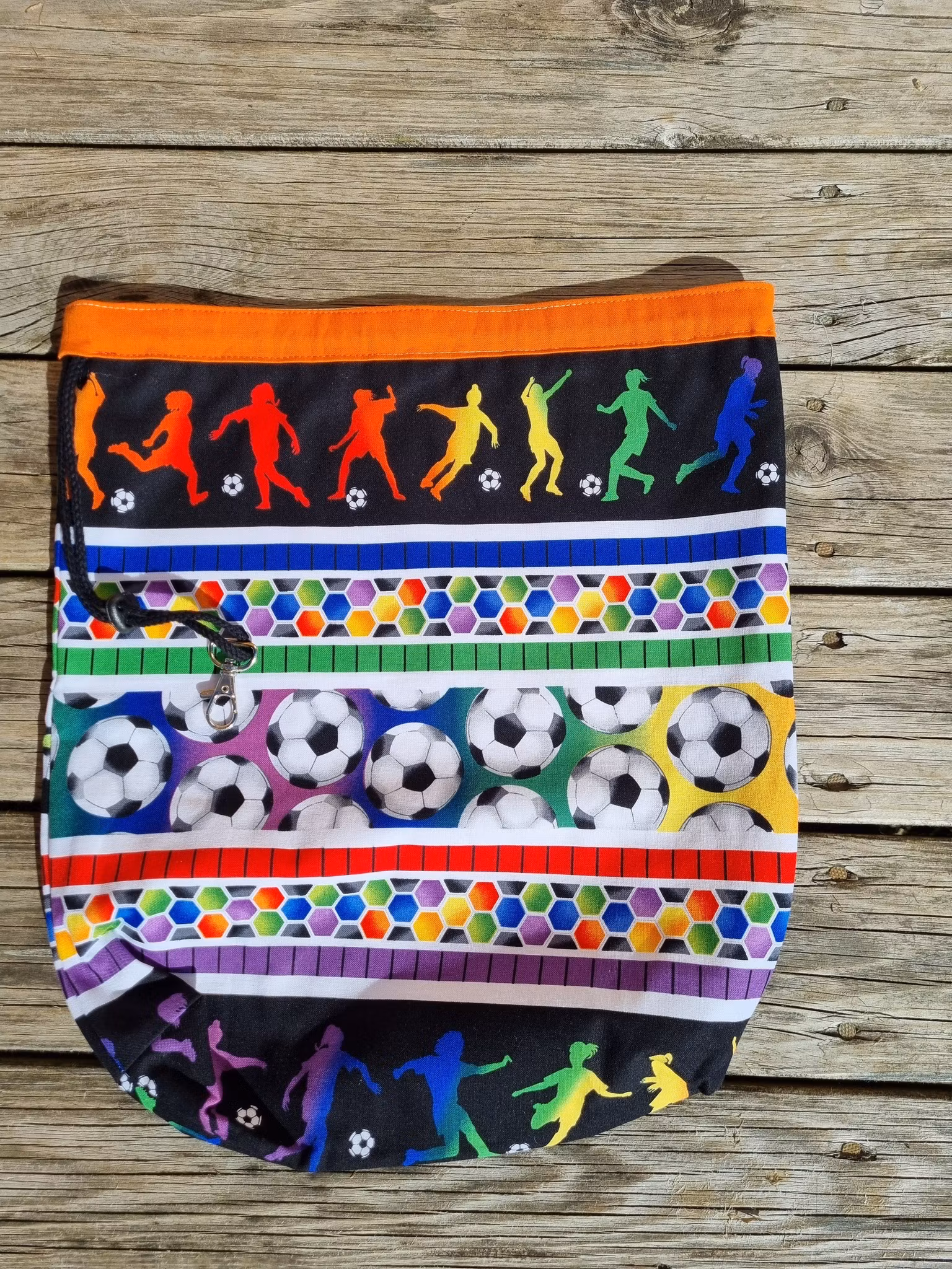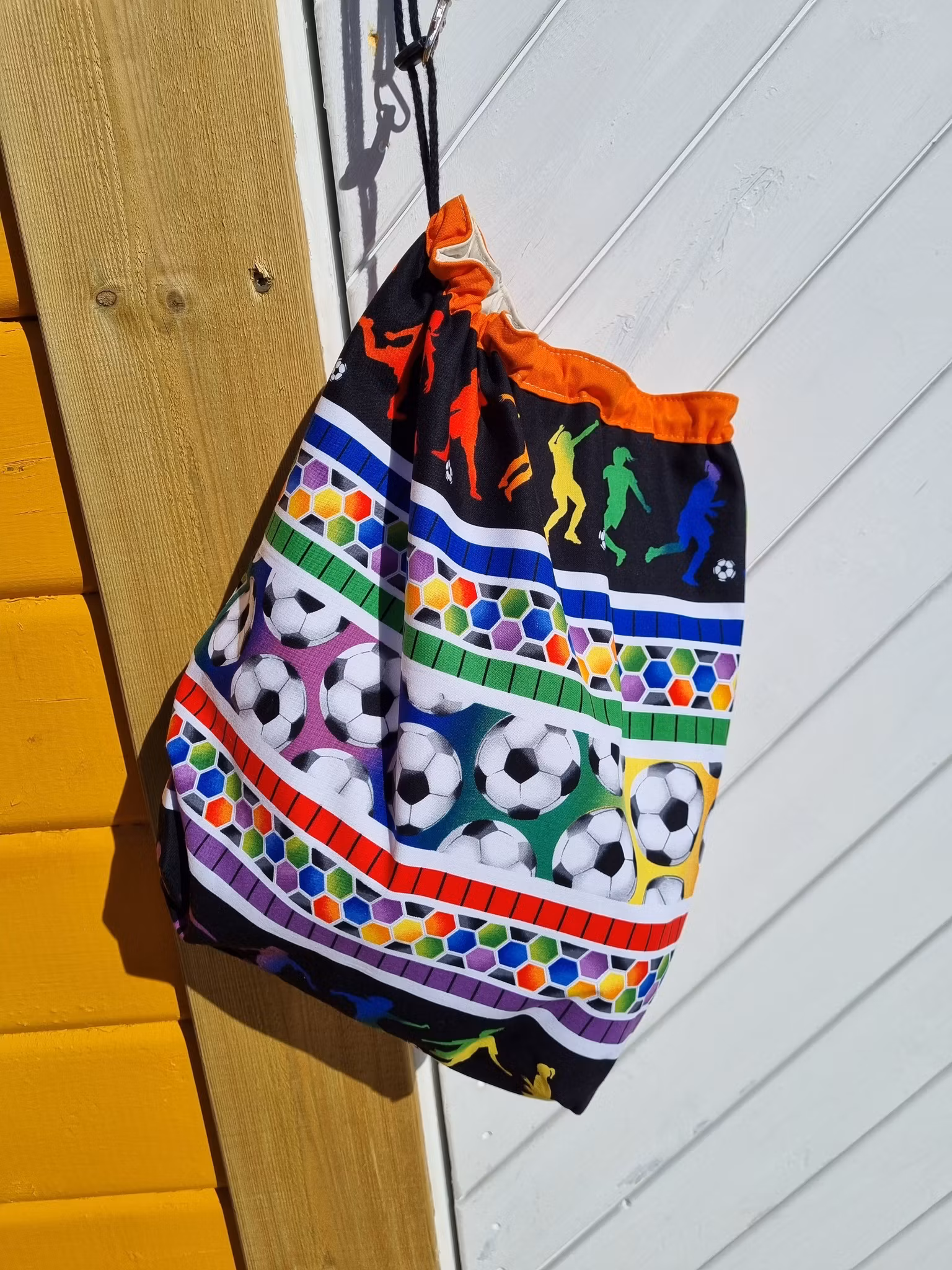 Snørepose med snorstopper og karabinkrok som som passer fint til mindre prosjekter, nattøy osv.  Posen er sydd i 100% bomull av quiltekvalitet og foret med