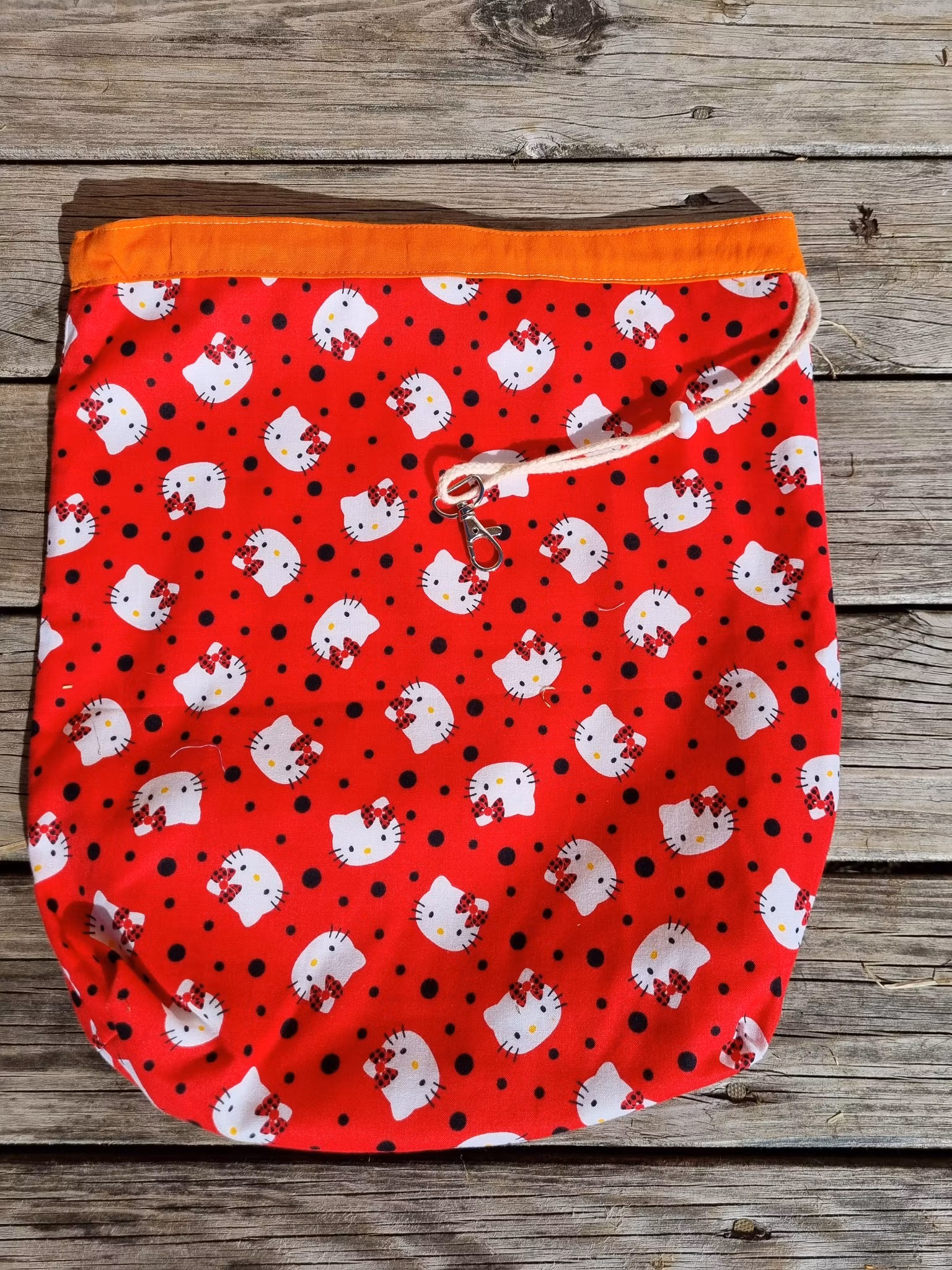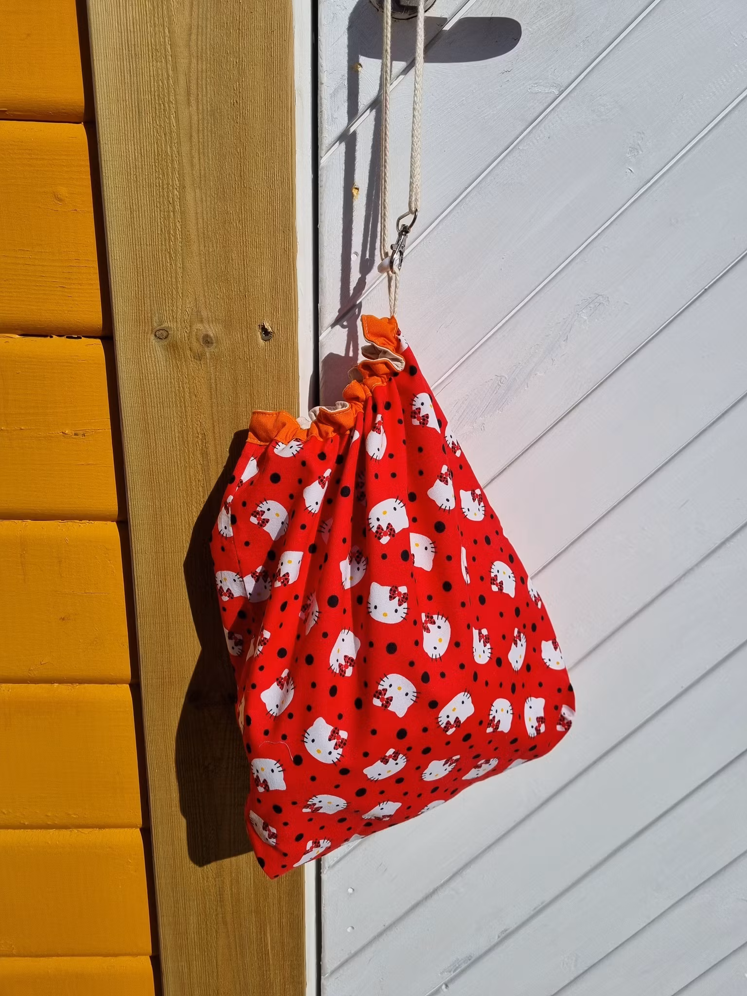 Snørepose med snorstopper og karabinkrok som som passer fint til mindre prosjekter, nattøy osv. Posen er sydd i 100% bomull av quiltekvalitet og foret med bomull. Posen er ikke vattert.