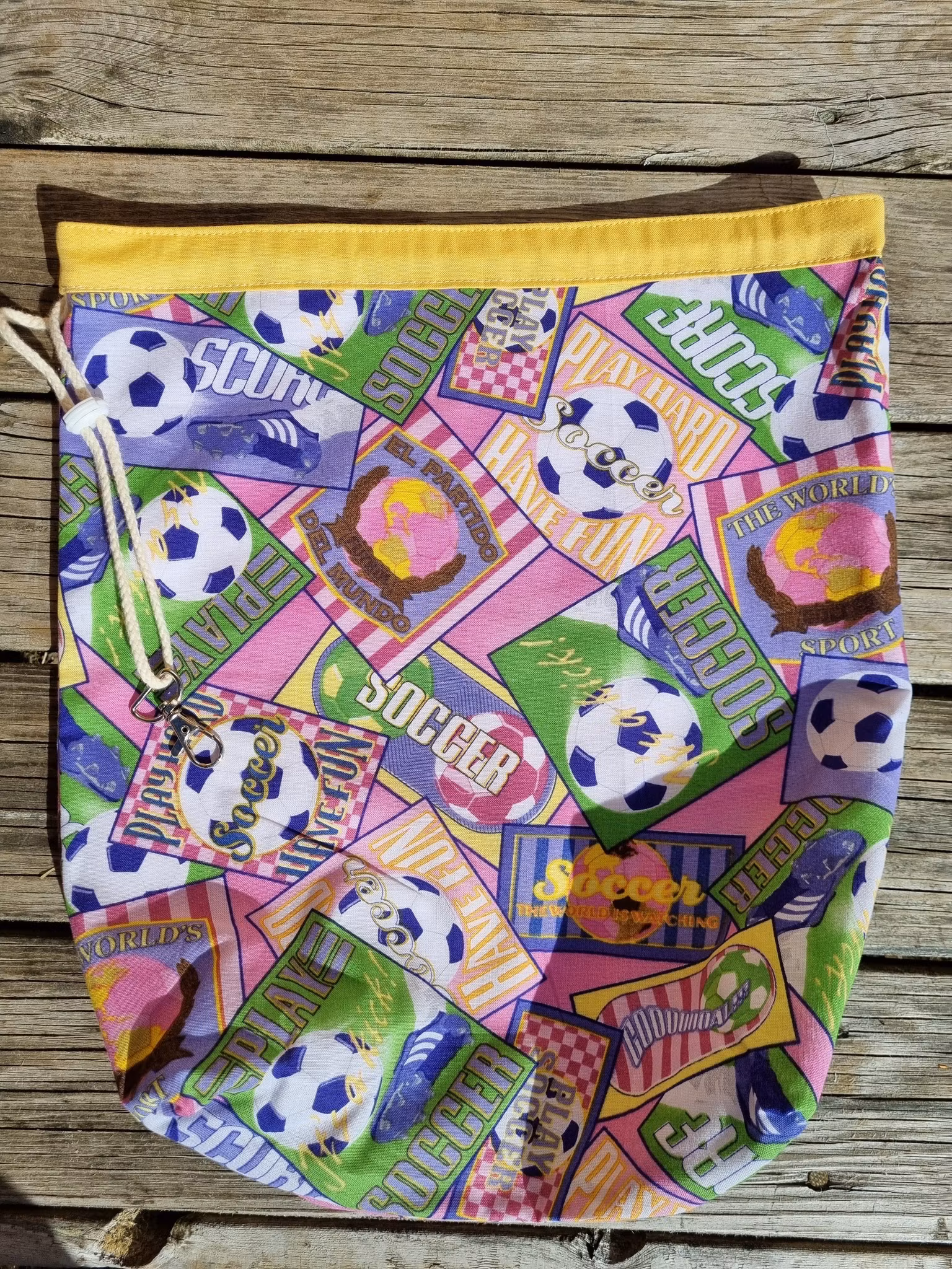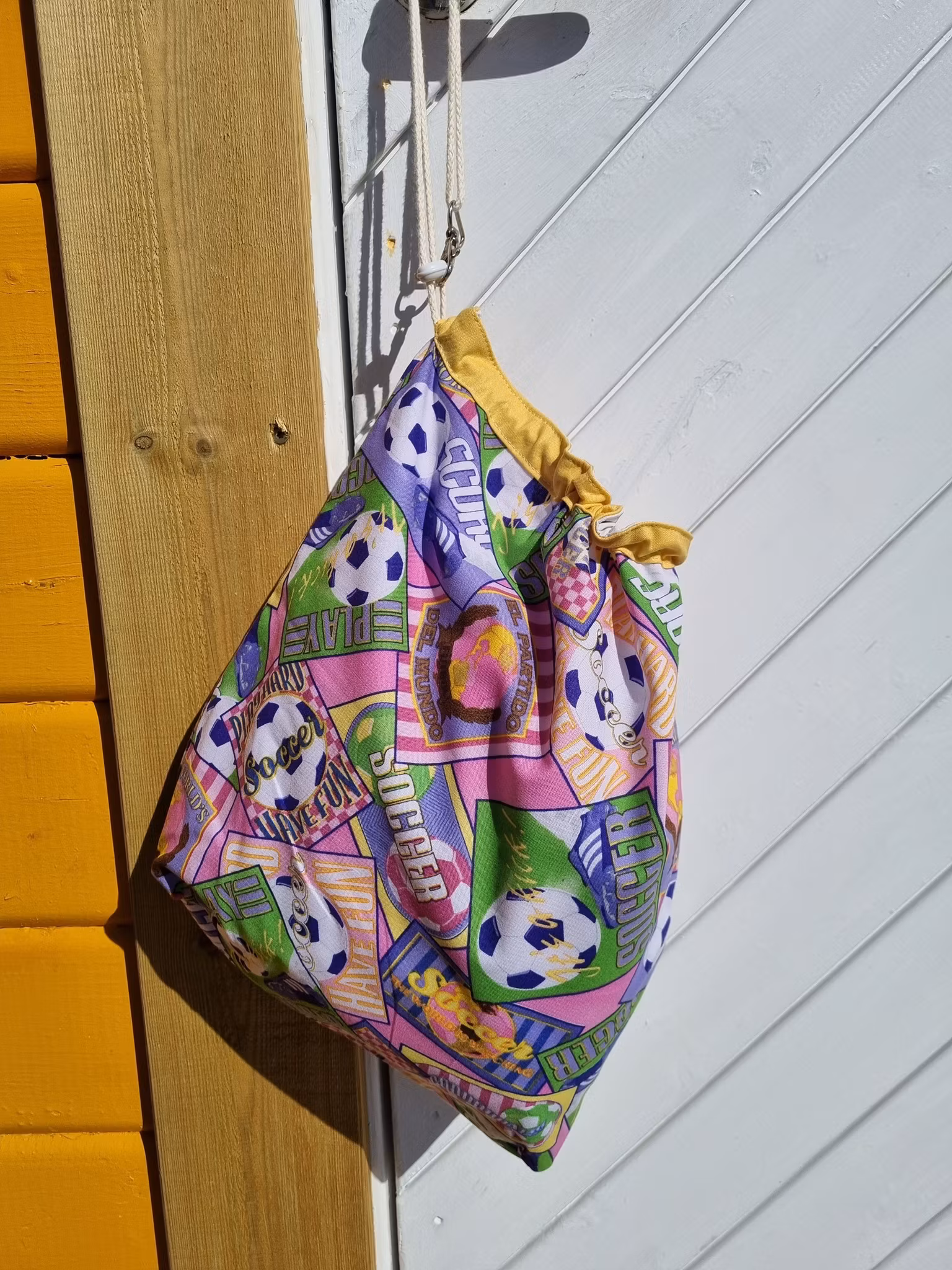 Snørepose med snorstopper og karabinkrok som som passer fint til mindre prosjekter, nattøy osv. Posen er sydd i 100% bomull av quiltekvalitet og foret med bomull. Posen er ikke vattert.