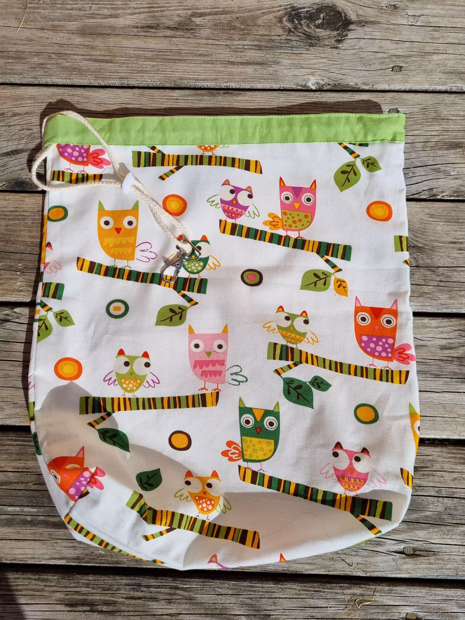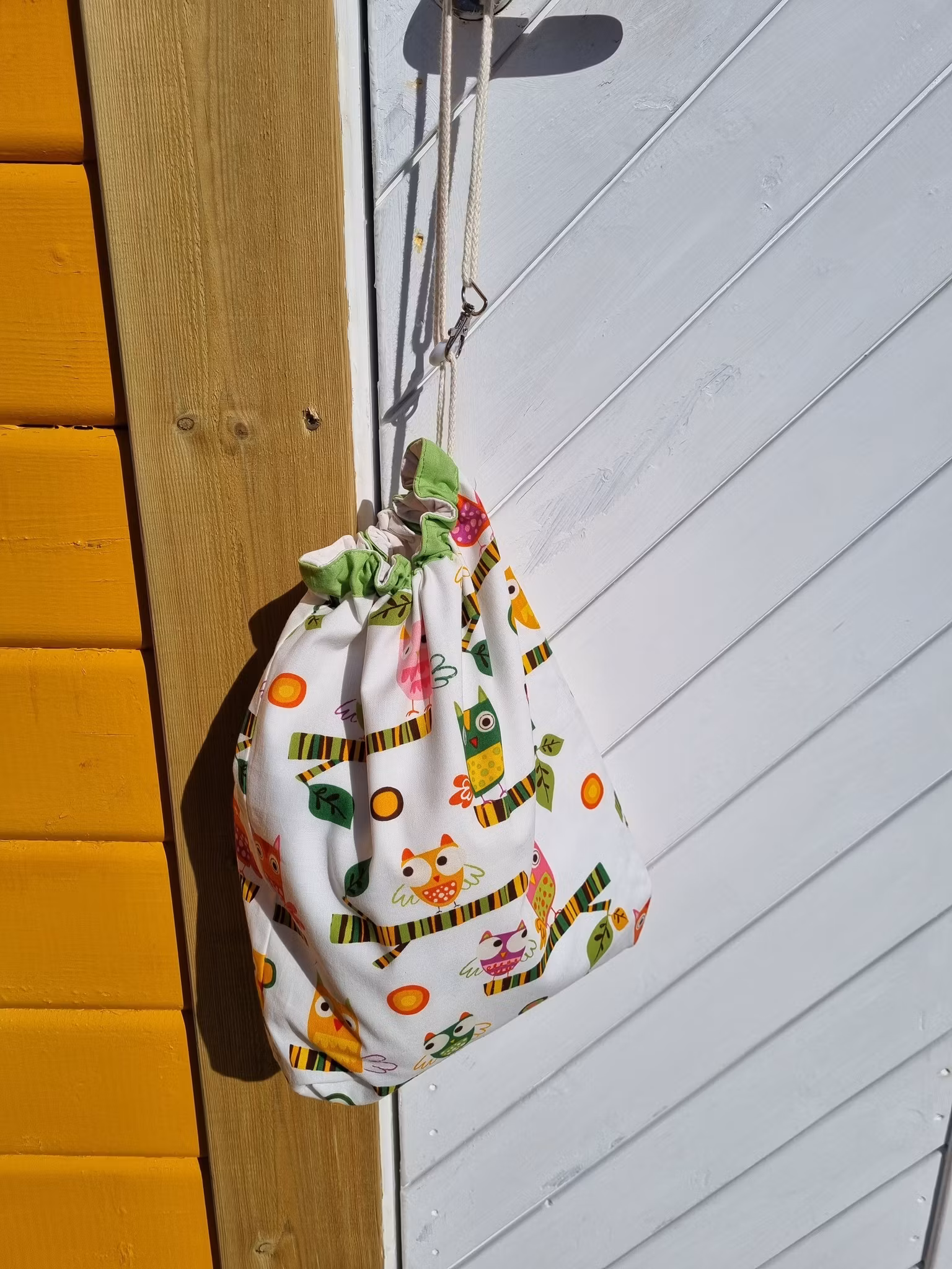 Snørepose med snorstopper og karabinkrok som som passer fint til mindre prosjekter, nattøy osv.  Posen er sydd i 100% bomull av quiltekvalitet og foret med