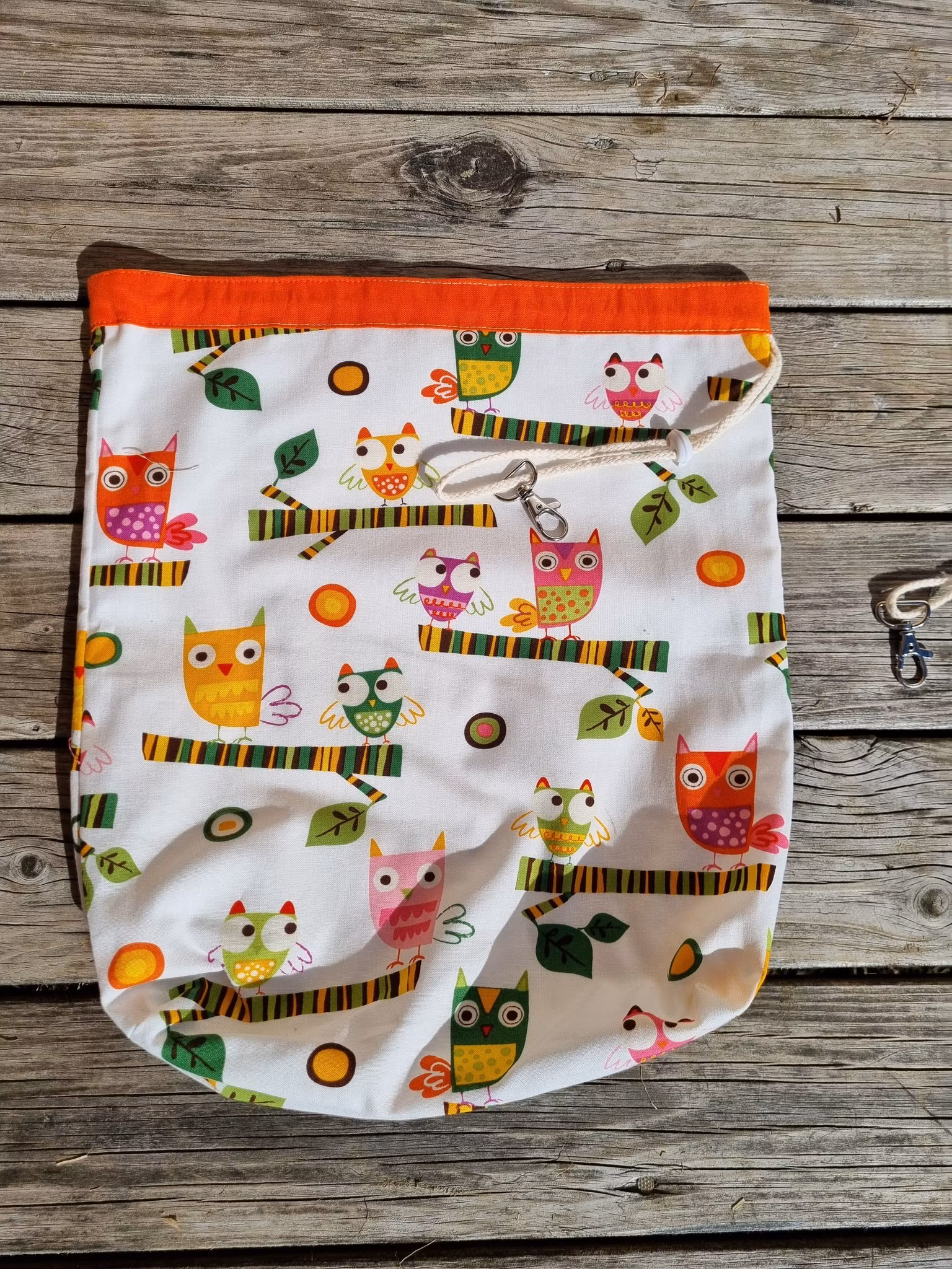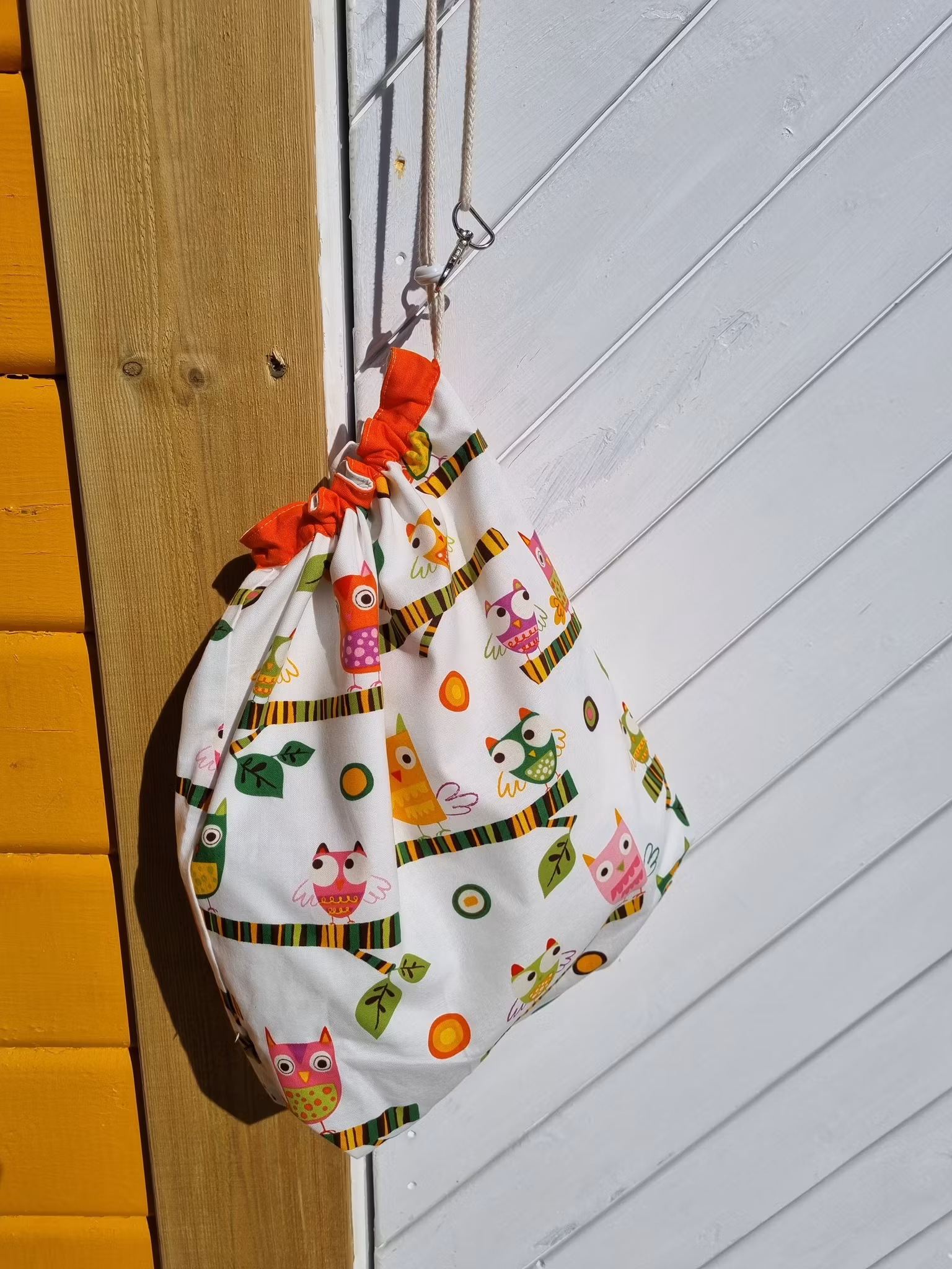 Snørepose med snorstopper og karabinkrok som som passer fint til mindre prosjekter, nattøy osv.  Posen er sydd i 100% bomull av quiltekvalitet og foret med