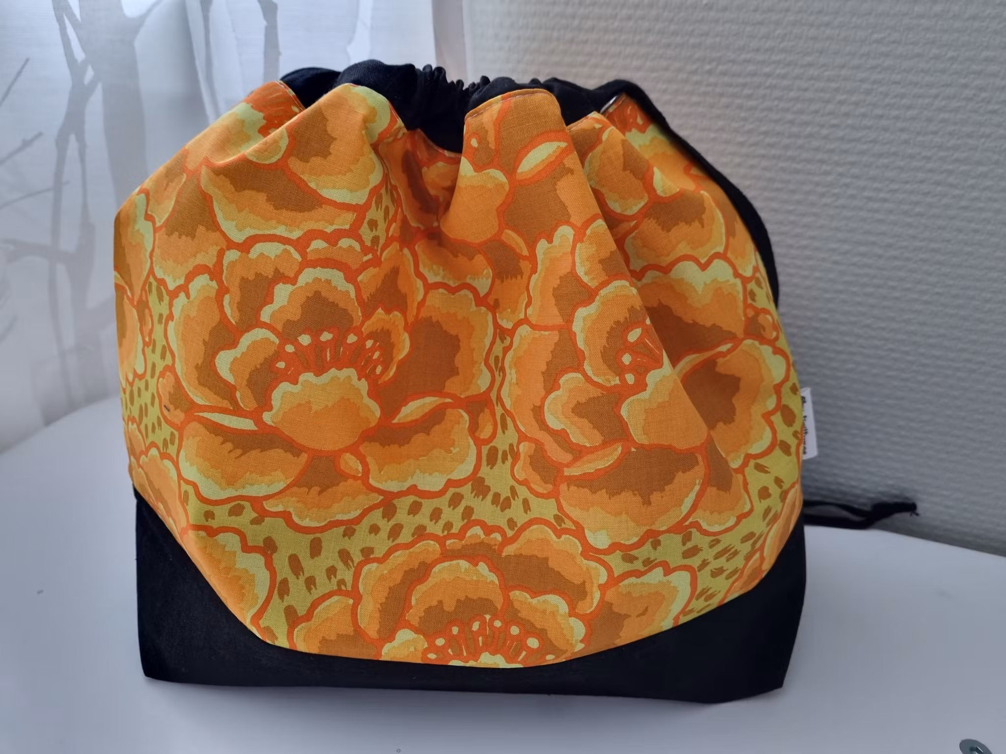 Romslig prosjektveske sydd i sort grunge og et stoff fra Kaffe Fassett Design. Serien heter Tonal Floral. Vesken er vattert, og lik på begge sider. Høyde 25 cm, bredde: 36 cm og dybde: 12 cm. Vesken er gul med sorte bånd.