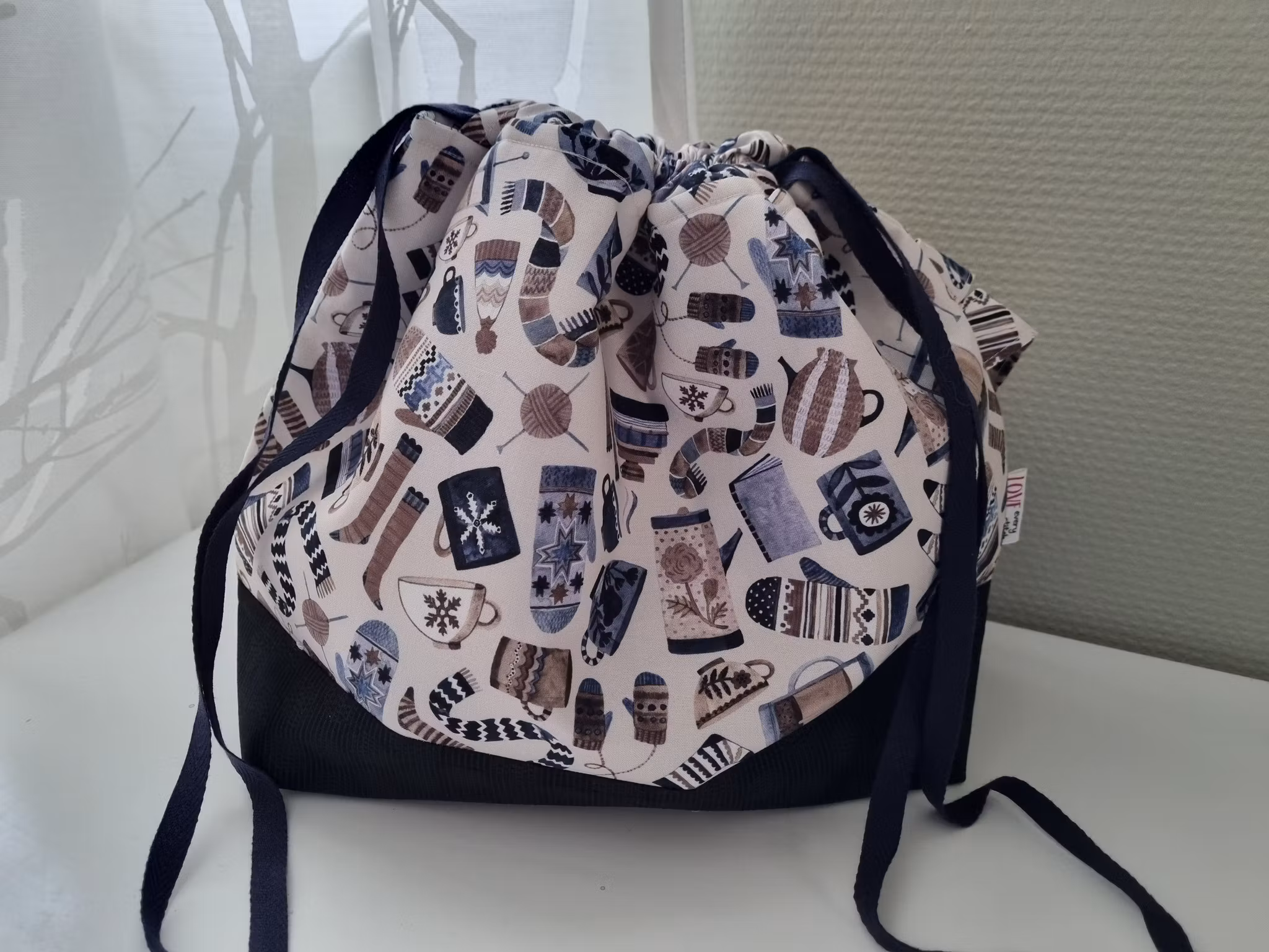 Romslig prosjektveske sydd i stoff med strikkemotiv. Bunn med kontraststoff nederst og snørelukking.
