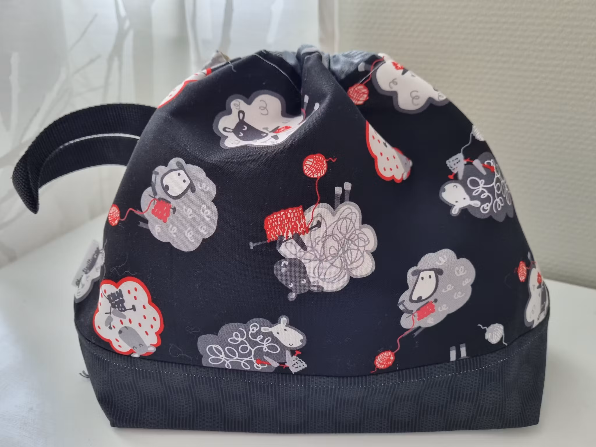 Romslig prosjektveske sydd i dekorstoff med strikkemotiv. Bunn med kontraststoff nederst og snørelukking.