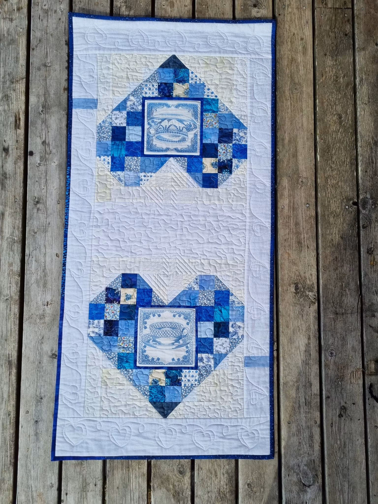Blå løper med maskinbrodert tekopp inni hvert hjerte kr 1 000 Løper sydd i quiltestoff i bomull, både forside og bakside. Vattert og quiltet.Mål: 52x109 cm I lager. Legg i handlekurv Lagerbalanse: 1 Artikkelnummer: 143 Del Informasjon Løper sydd i quiltestoff i bomull, både forside og bakside. Vattert og quiltet.Mål: 52x109 cm