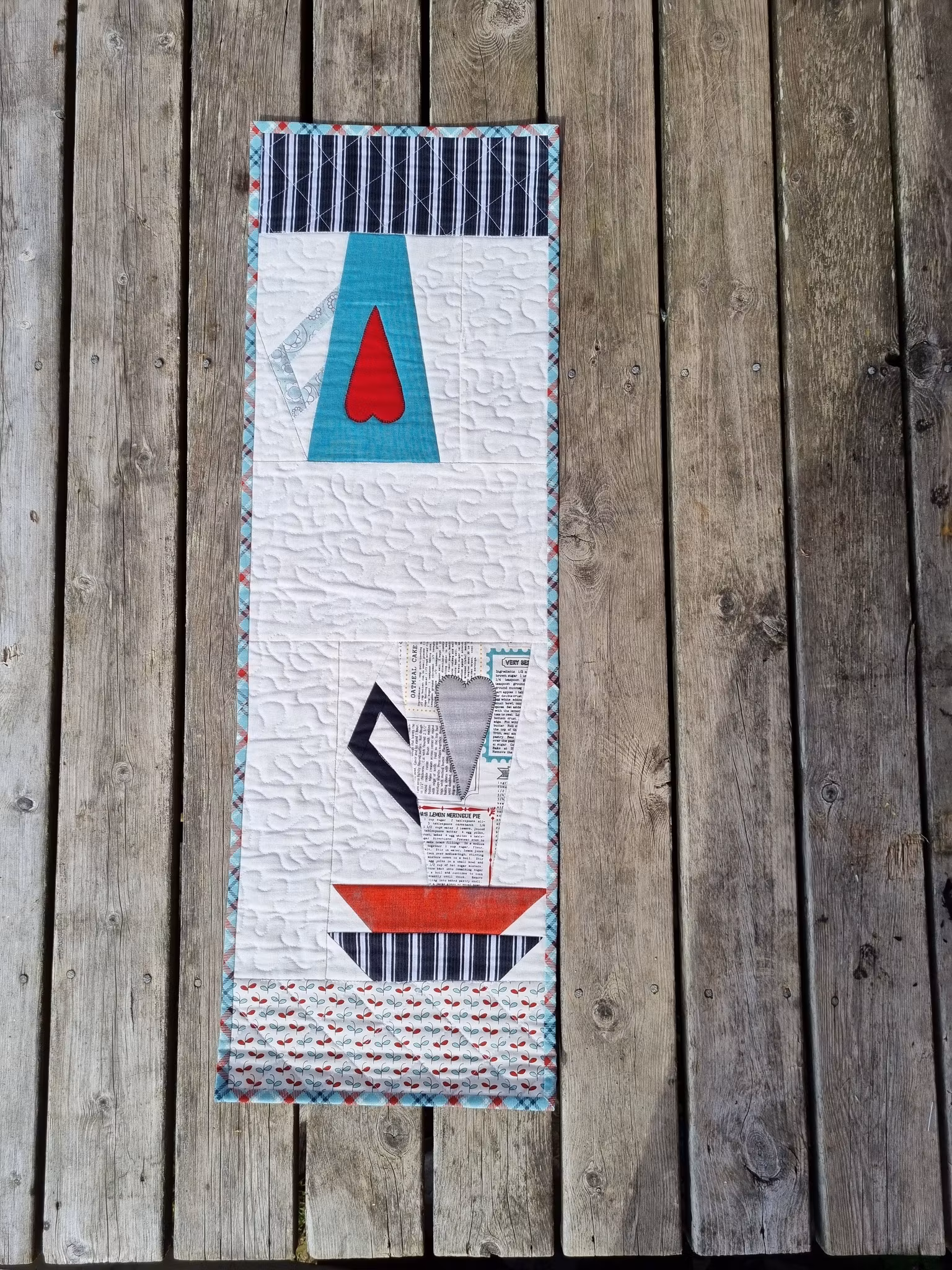 Liten løper med bokksøm og applikasjoner, t-kopper kr 400 Liten løper sydd i quiltestoff i bomull, både forside og bakside. Vattert og quiltet.Mål: 27x82 cm I lager. Legg i handlekurv Lagerbalanse: 1 Artikkelnummer: 138 Del Informasjon Liten løper sydd i quiltestoff i bomull, både forside og bakside. Vattert og quiltet.Mål: 27x82 cm