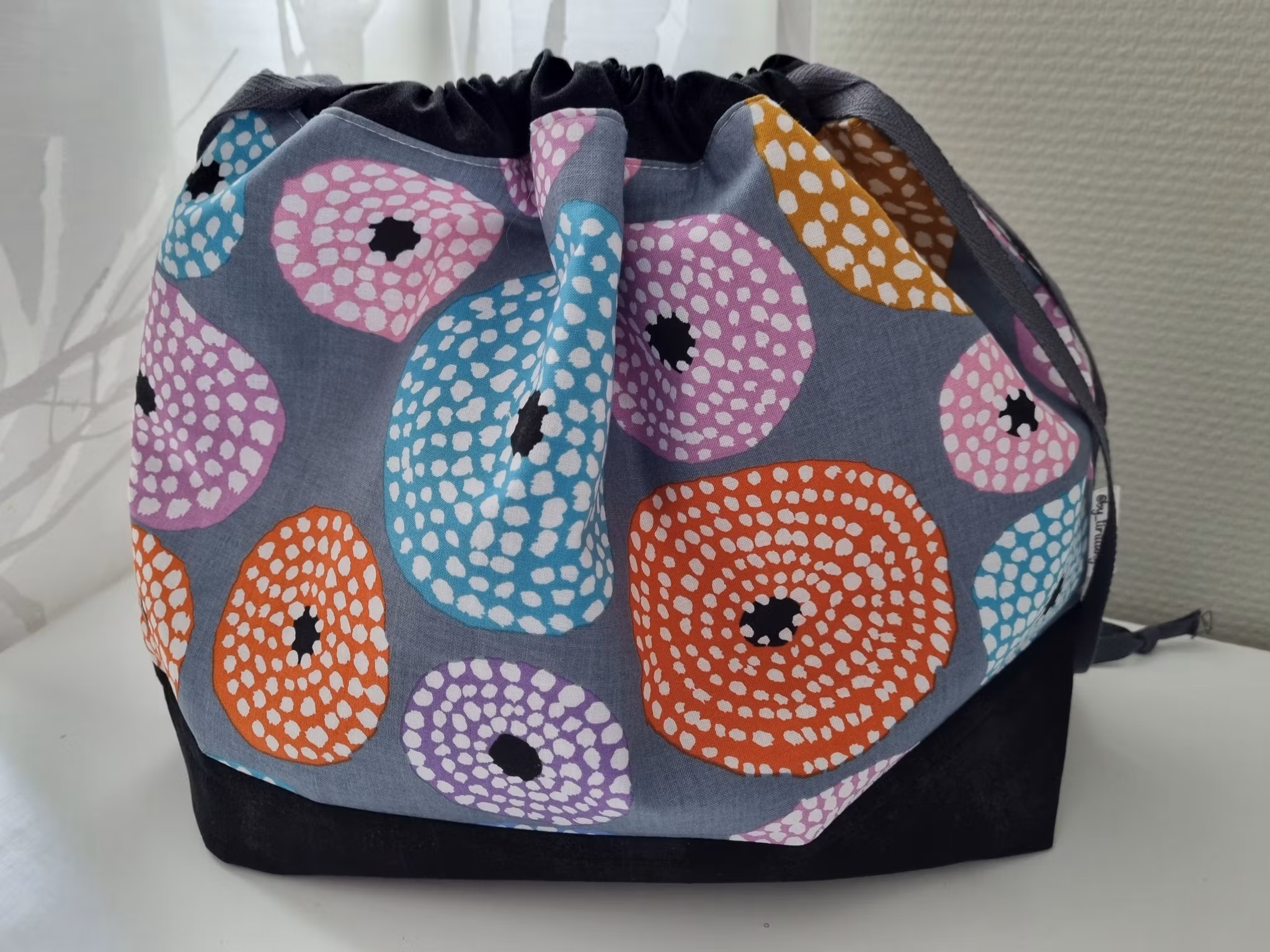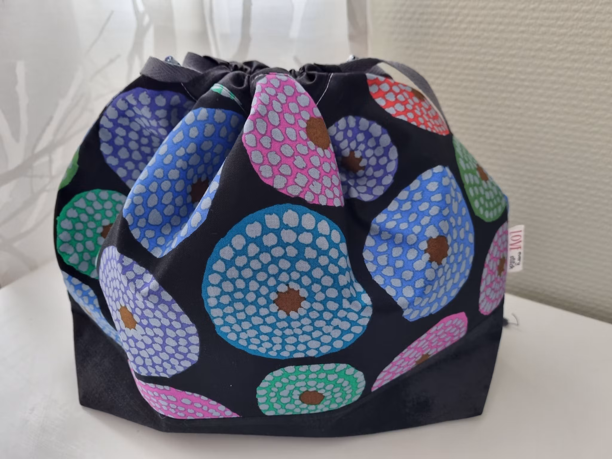 Romslig prosjektveske sydd i sort grunge og et stoff fra Kaffe Fassett Design. Serien heter Disks.