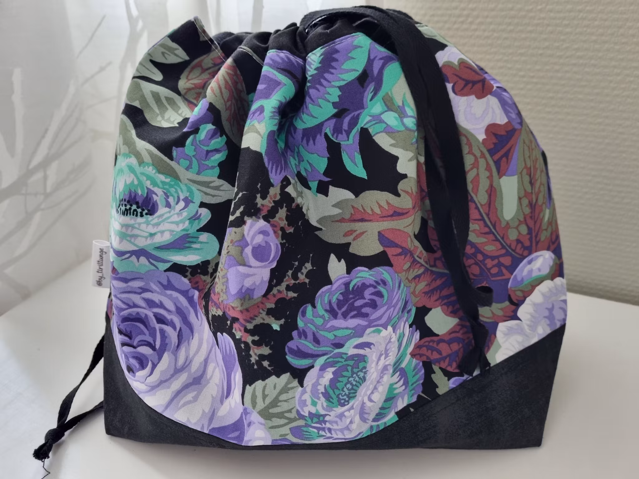 Romslig prosjektveske sydd i sort grunge og et stoff fra Kaffe Fassett Design.