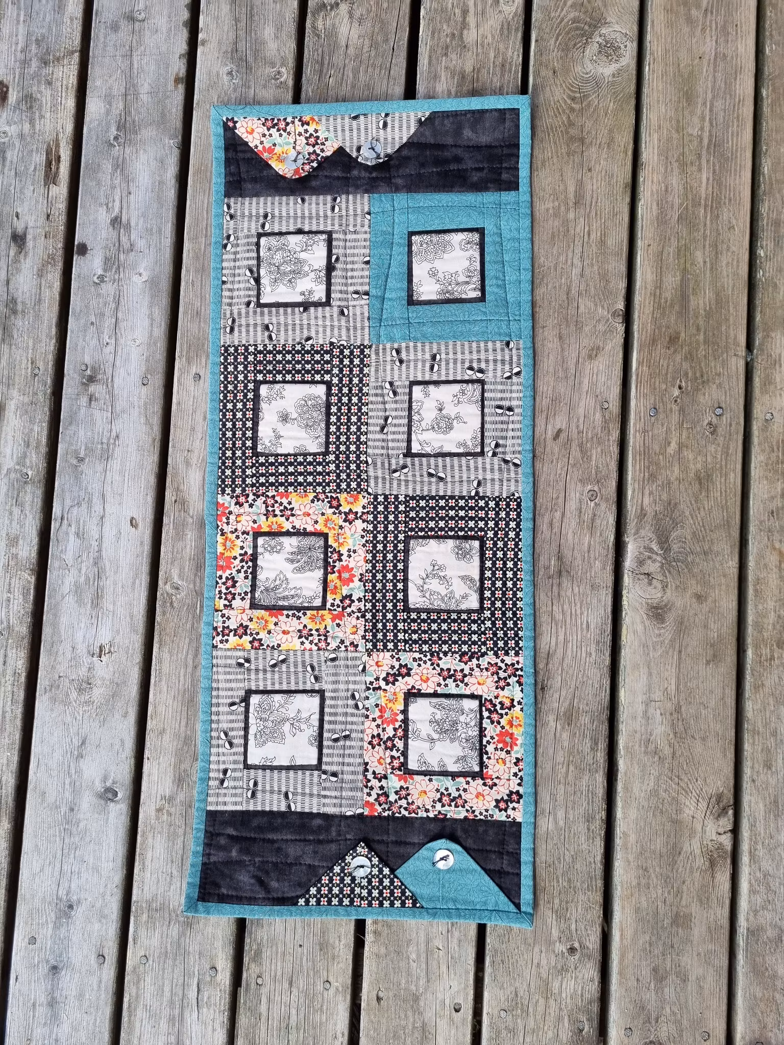 Løper sydd i quiltestoff i bomull, både forside og bakside. Vattert og quiltet.
