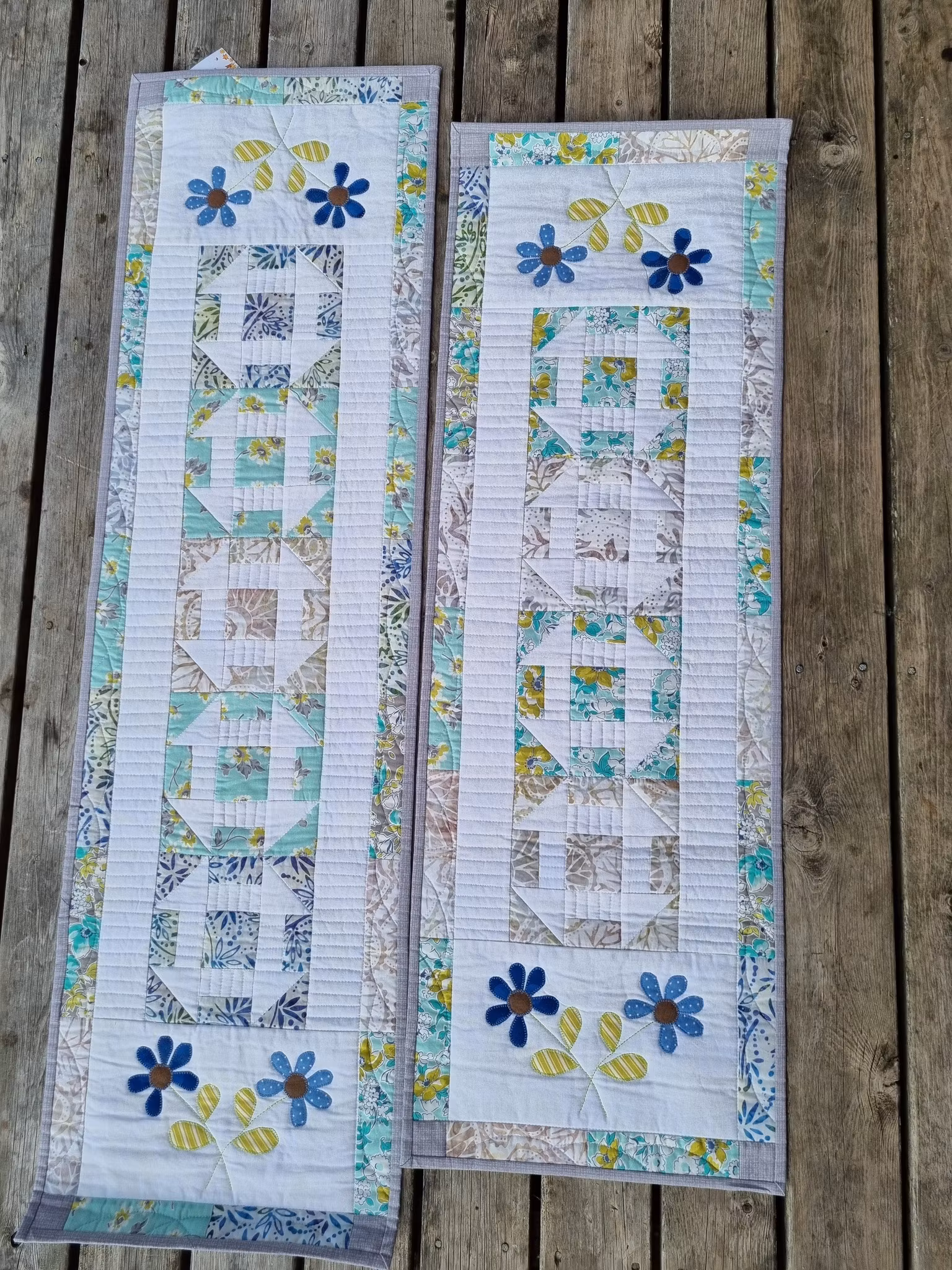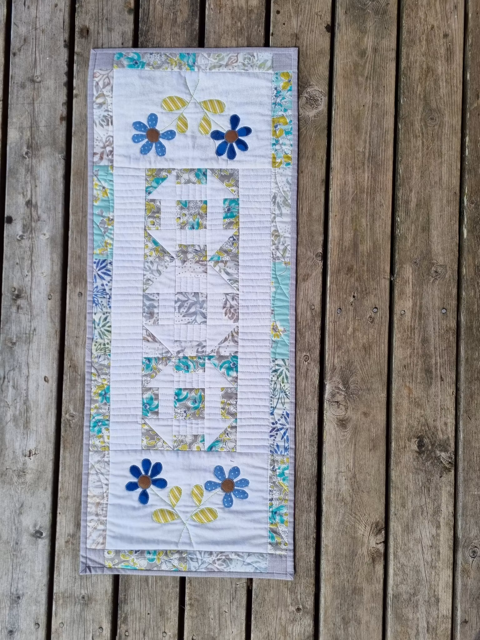Løper sydd i quiltestoff i bomull, både forside og bakside. Vattert og quiltet, med små blomsterappllikasjoner.